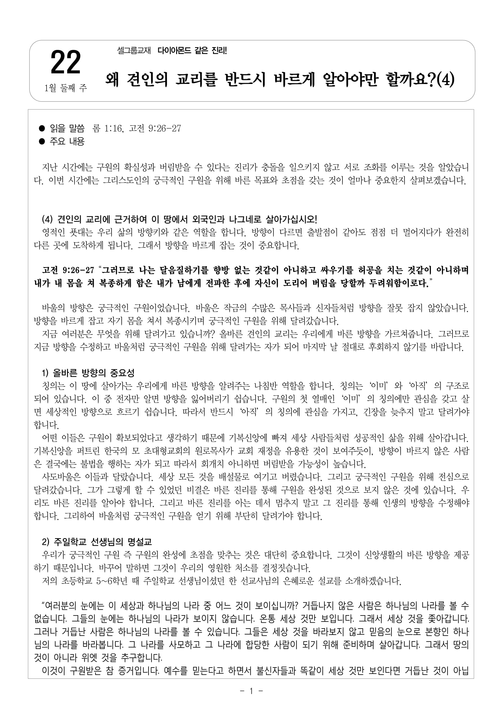 1월 둘째 주 셀그룹교재 [다이아몬드같은 진리]-[4]왜 견인의 교리를 반드시 바르게 알아야만 할까요?