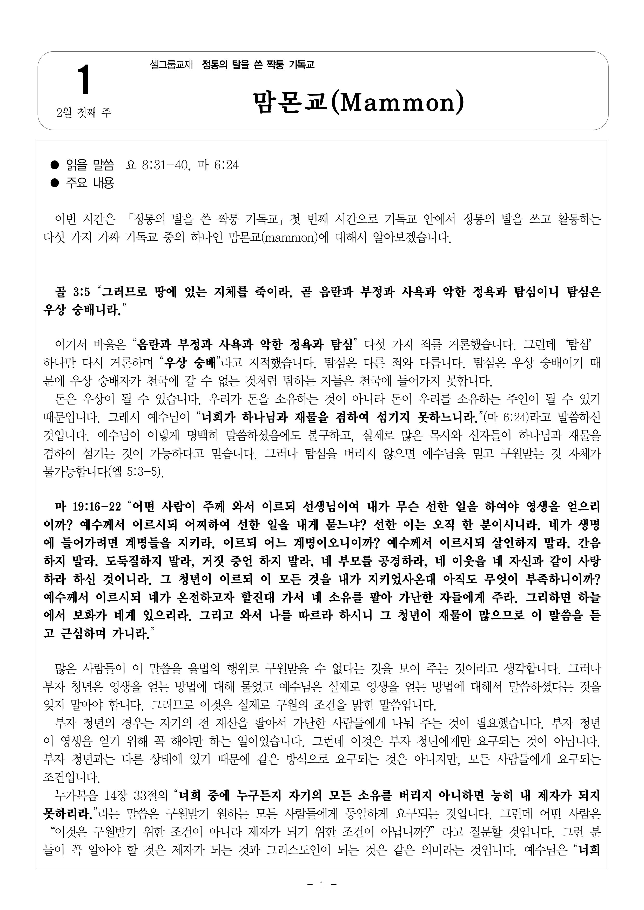 2월 첫째 주 셀그룹교재 [정통의 탈을 쓴 짝퉁 기독교]-[1]맘몬교(Mammon)
