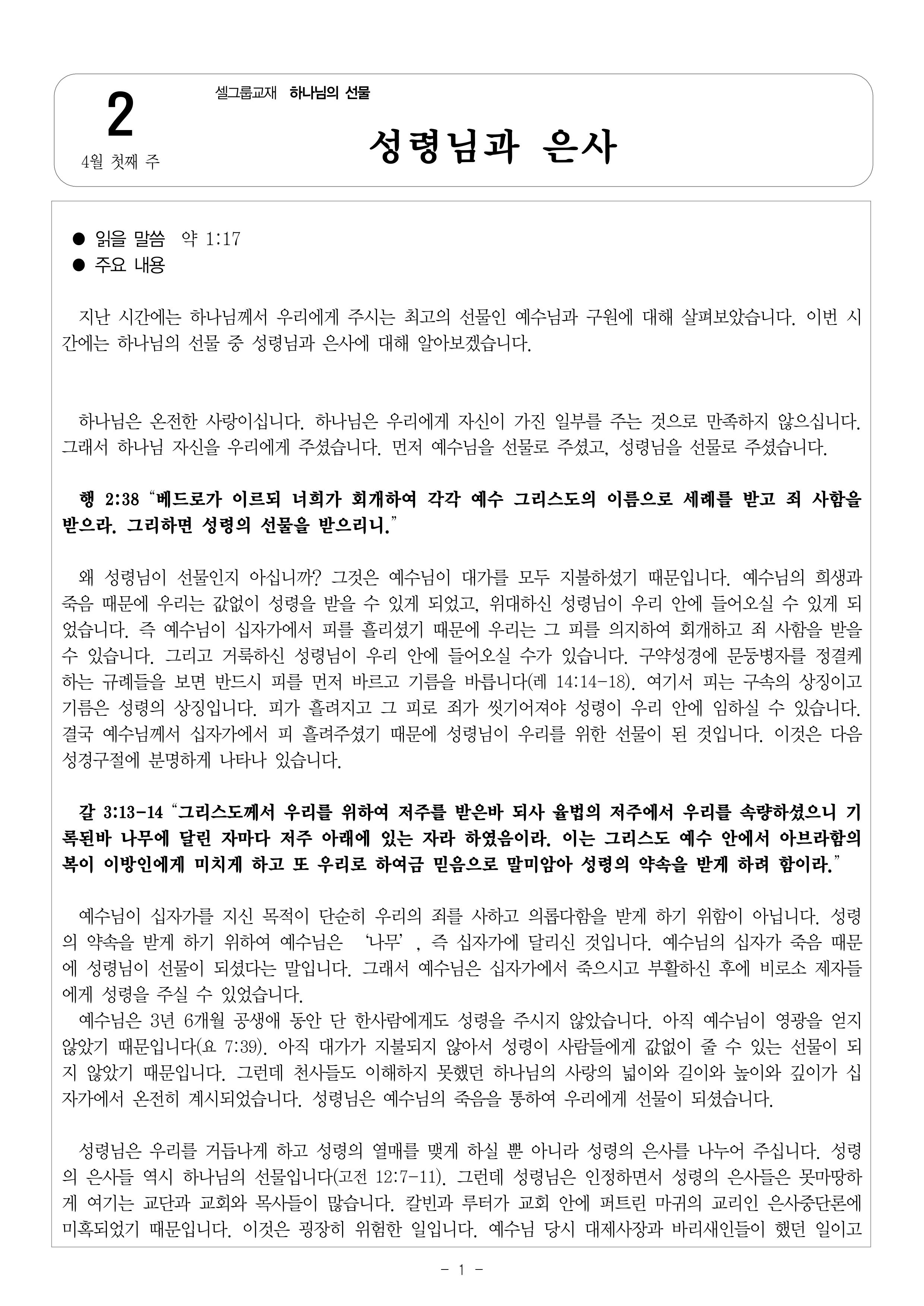 4월 첫째 주 셀그룹교재 [하나님의 선물]-[2]성령님과 은사
