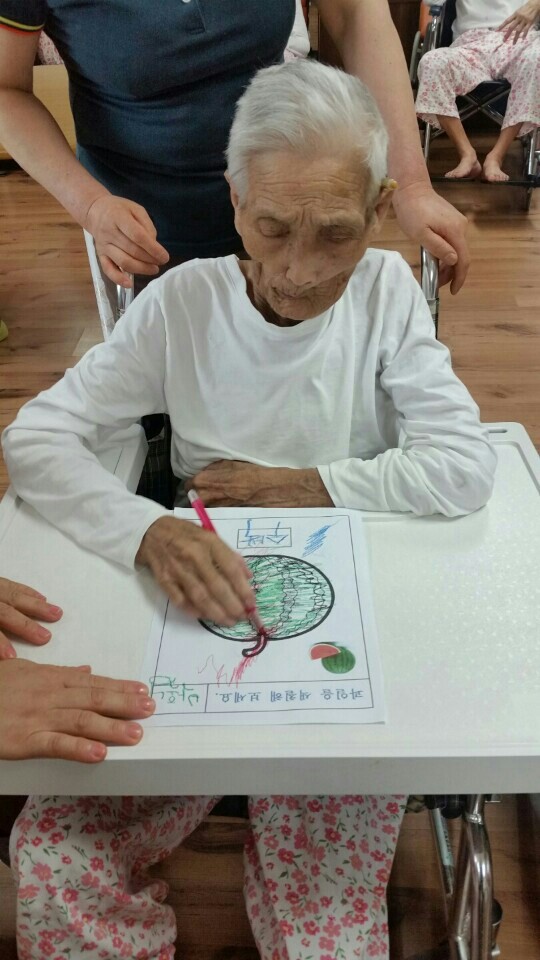 몇 달 전만해도 곧 돌아가신다고 했던 분이 요양 병원의 치료 프로그램에 참여하여, 색연필로 수박 그림에 정확히 색칠을 하실 수 있게 되셨습니다. 이것을 본 며느리 집사님께서는 “이것이 별 것 아니라고 생각되실 수도 있지만 이전에는 전혀 하시지 못하셨던 것이기에 시어머니에게는 기적과도 같은 일입니다!”라고 하시며 기뻐하셨습니다.