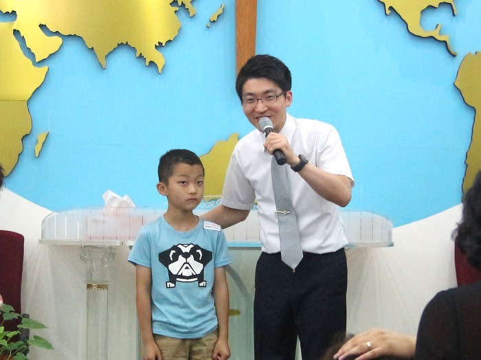 어머니와 함께 치유성회에 참석한 9살 남자 어린이입니다. 어렸을 때 고열을 여러 번 앓았고, 머리를 쥐어 짤 정도로 심한 어지러움증이 있었으며, 4세 때부터는 오른쪽 귀의 청력이 왼쪽보다 약해져서 습관적으로 왼쪽 귀를 기울이며 "뭐라고요? 다시 말해주세요!"라고 하는 상태로 집회에 참석했습니다.