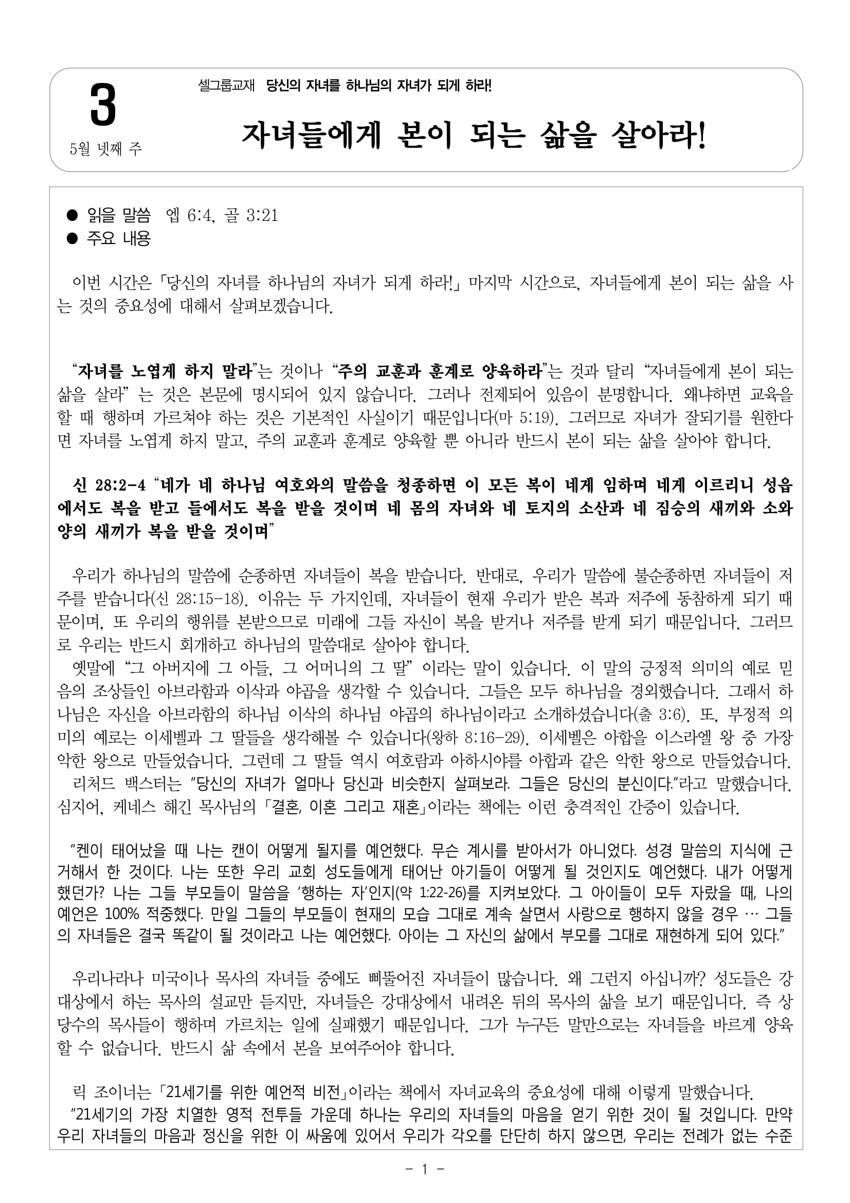 5월 넷째 주 셀그룹교재 [당신의 자녀를 하나님의 자녀가 되게 하라!]-[3]자녀들에게 본이 되는 삶을 살아라!