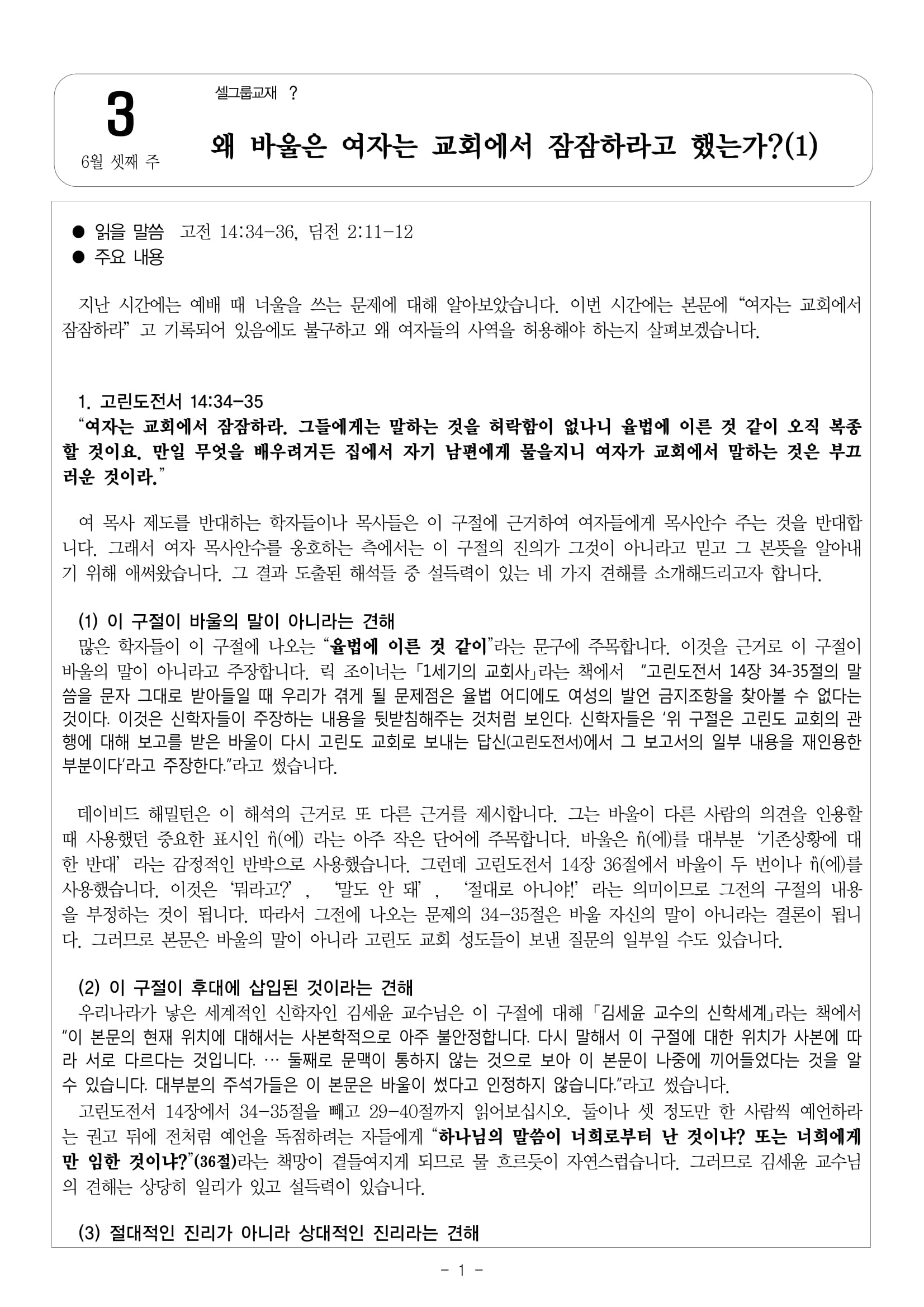 6월 셋째 주 셀그룹교재 [?]-[3]왜 바울은 여자는 교회에서 잠잠하라고 했는가?(1)