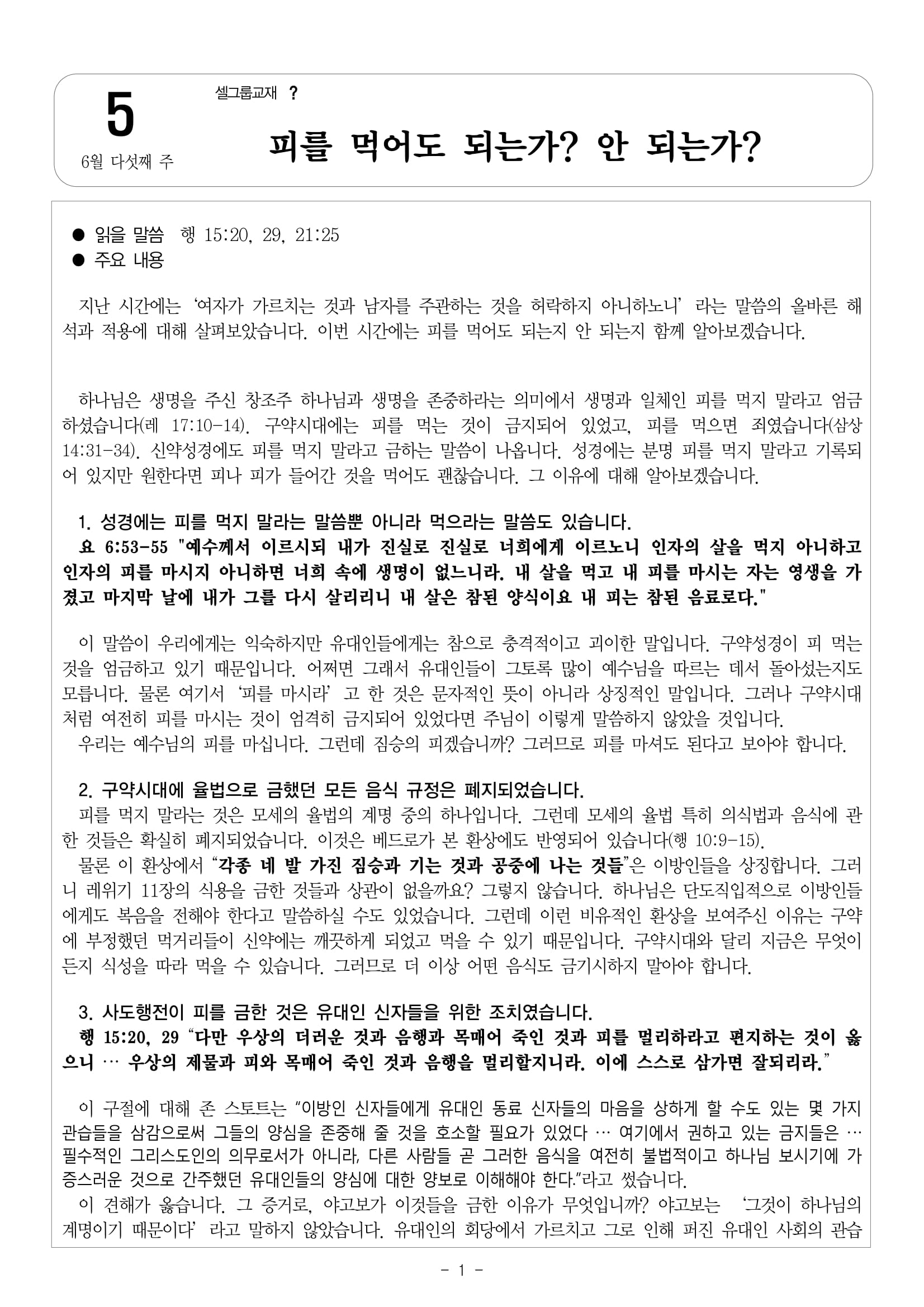 6월 다섯째 주 셀그룹교재 [?]-[5]피를 먹어도 되는가? 안 되는가?
