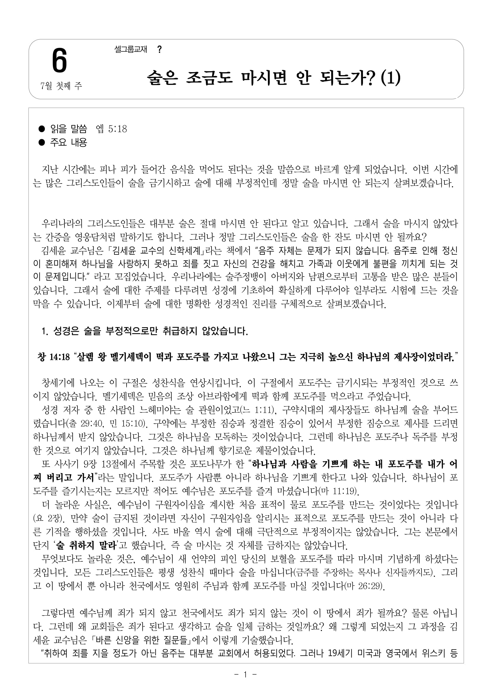 7월 첫째 주 셀그룹교재 [?]-[6]술은 조금도 마시면 안 되는가?(1)