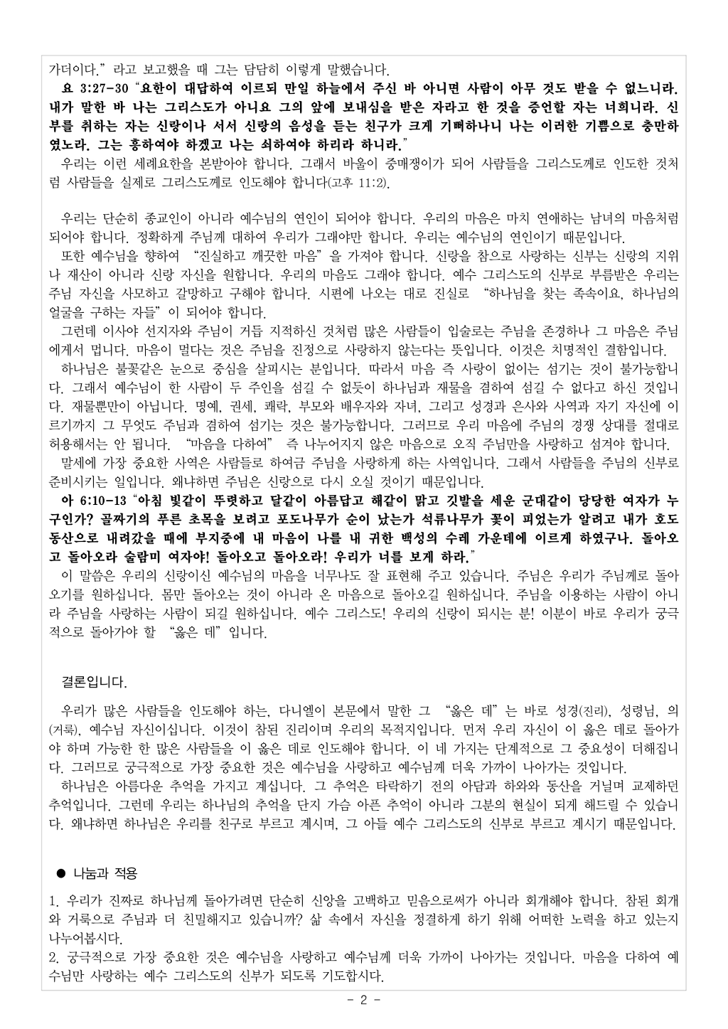 | 이전글 | [우리의 사명은 많은 사람을 옳은 데로 돌아오게 하는 것입니다! 2] 6월 넷째 주 셀그룹 교재입니다. | Web Team | 2018-06-26 23:01:04 |