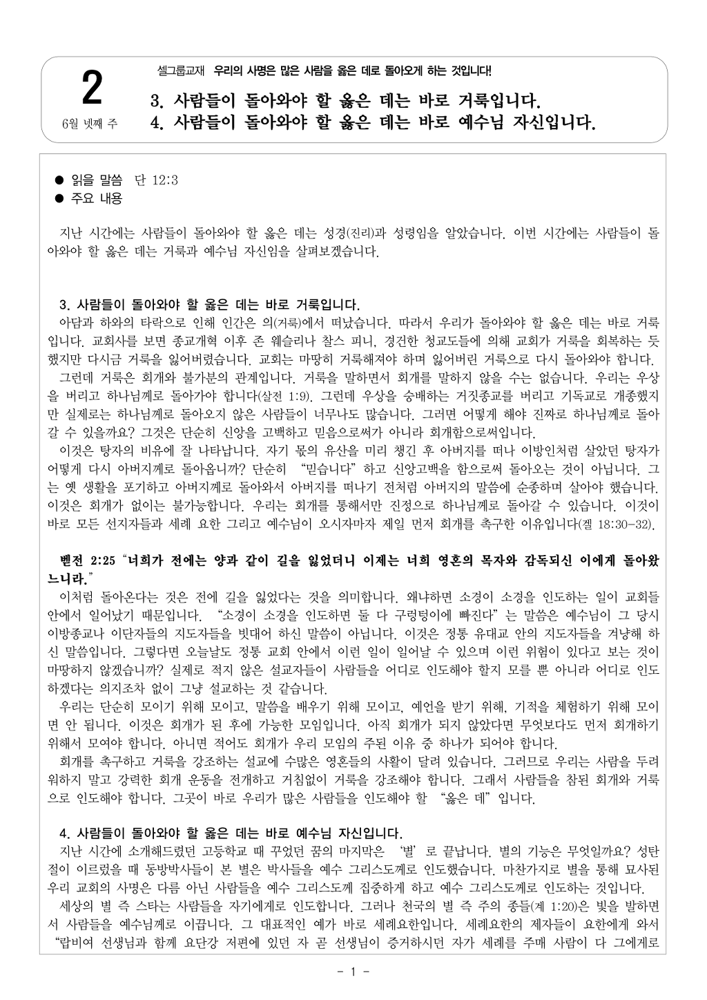 6월 넷째 주 셀그룹 교재입니다.