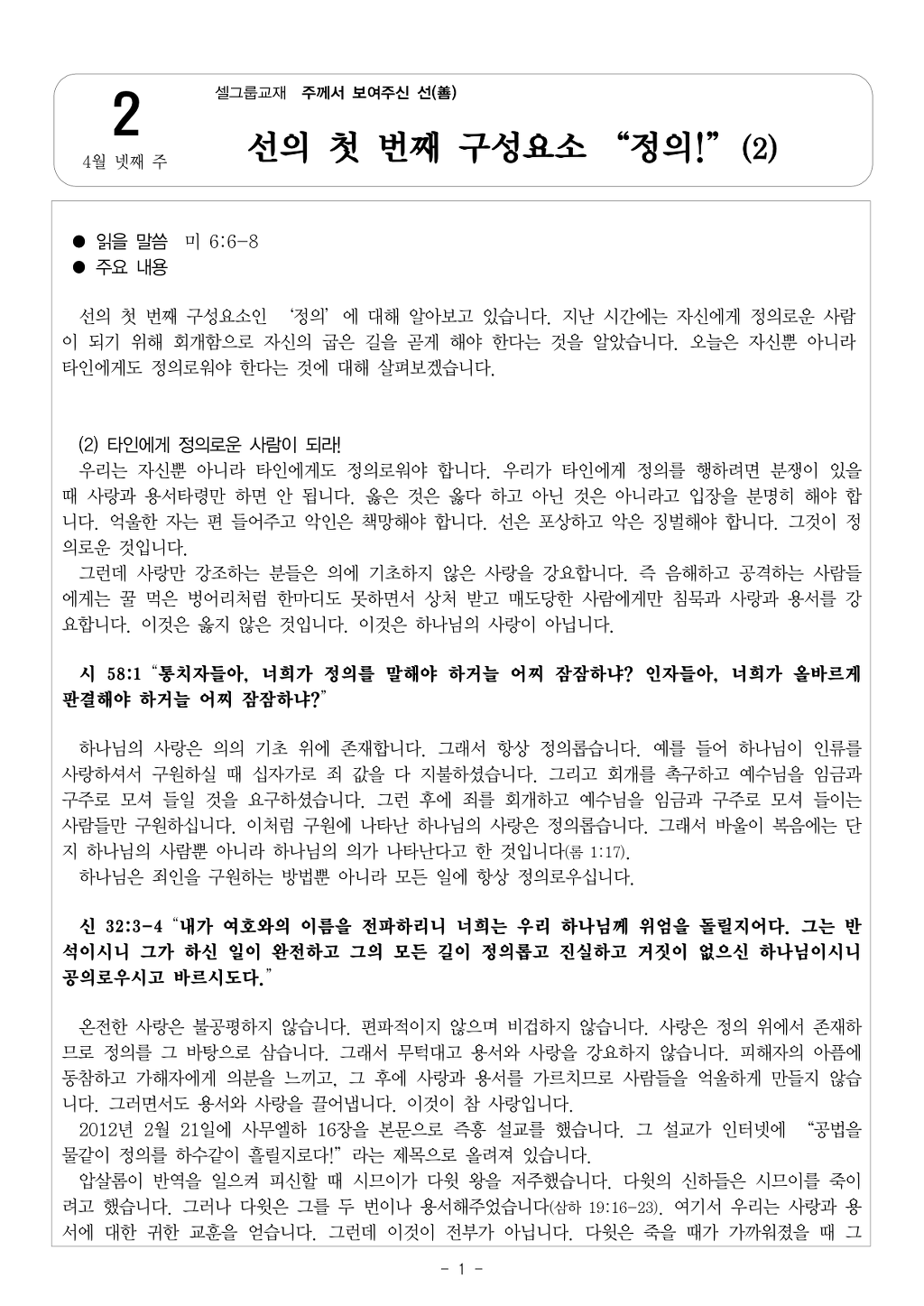 [주께서 보여주신 선(善) 1] 4월 셋째 주 셀그룹 교재입니다.