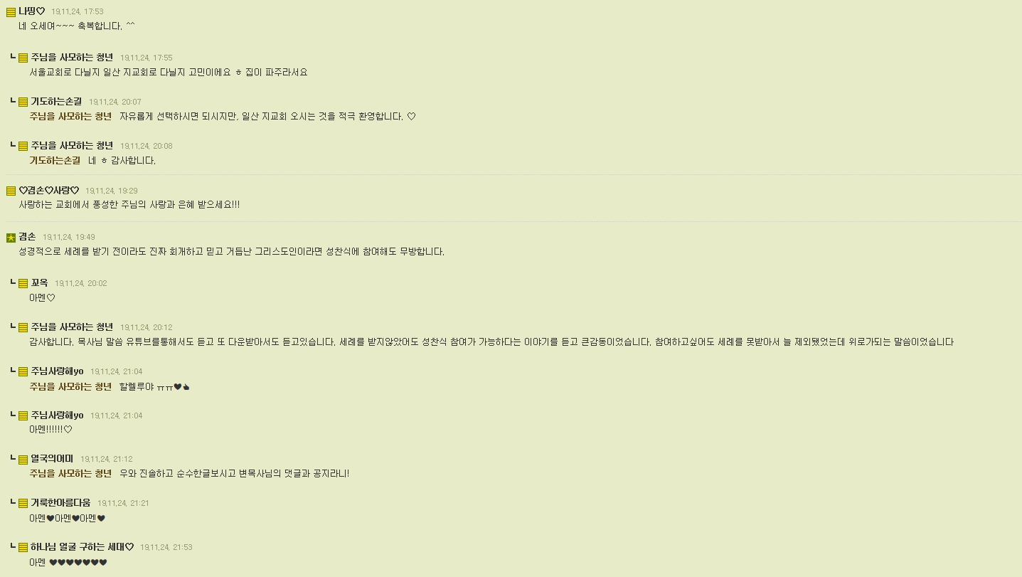 매 주일마다 명쾌하고 탁월한 요한계시록 설교가 선포되고 치유의 기적 예언의 기적들이 일어나는곳은 사랑하는교회밖에 없어보여요.... 그래서 옮겨볼까 생각도하는데 이러한 생각이 들때는 옮기는것이 맞는거겠죠? 그리고 궁금한것이 지난 주일에 성찬식을 하시던데 정말 세례받지않고도 거룩한 성찬에 참여 할 수있나요? 대부분이 세례못받으면 참여 못하게하잖아요 궁금합니당!