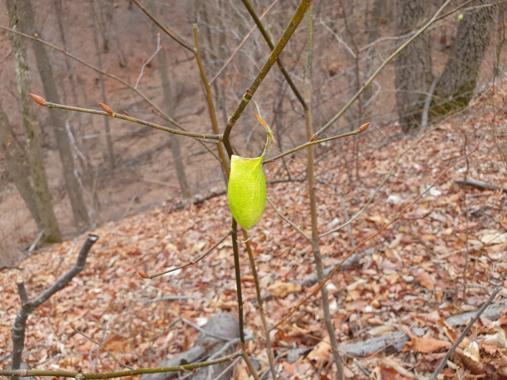 나방이 지은 집들이 마치 연두색 나뭇잎처럼 곳곳에 달려 있습니다.