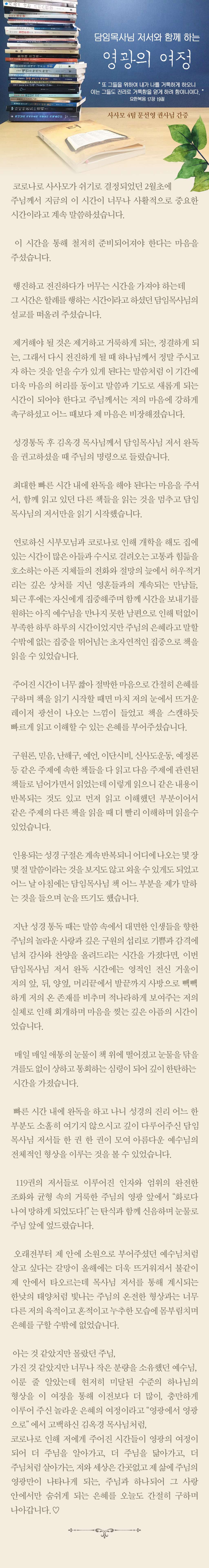 "담임목사님 저서와 함께 하는 영광의 여정" (사사모 4팀 문선영 권사 간증)