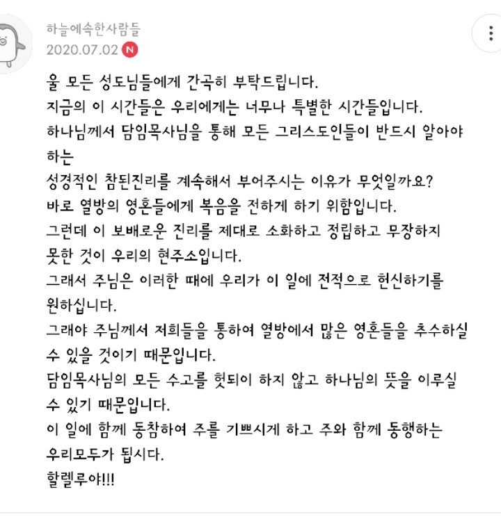| 다음글 | 정말 기독교방송에서 일주일 내내 틀어줘야 할 설교입니다ㅜㅜ 어떻게 이런 설교를 우리만 들을 수 있단 말입니까 ㅠㅠ | Web Team | 2020-07-04 10:43:54 |
