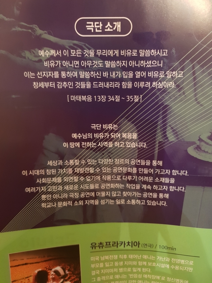 극 속에 어린 주인공의 절망적인 환경속에서도 끊임없이 말씀하시고 손을 건네시는 하나님의 사랑이 만져지는 것처럼 가깝게 느껴지는 연극이었습니다.