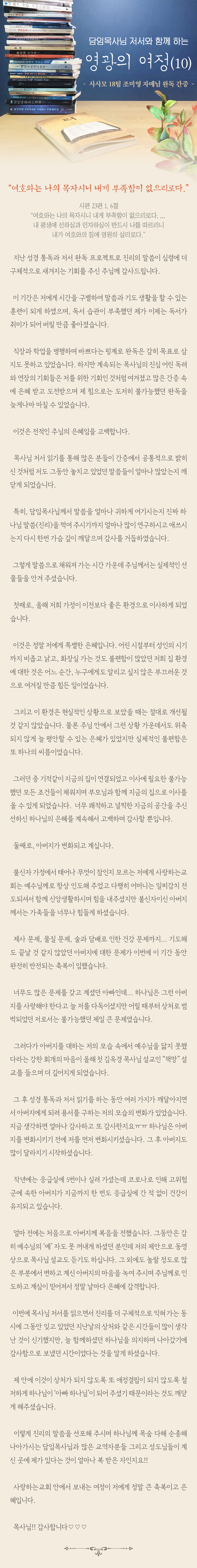 "담임목사님 저서와 함께 하는 영광의 여정 (10)" (사사모 18팀 조미영 자매님 완독 간증)