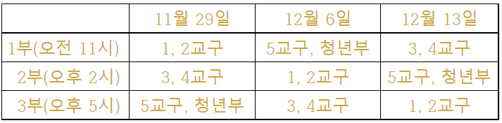 각 교구와 청년부는 매주 참석할 수 있는 예배 시간이 달라집니다. 다음 주 주일(11월 29일) 1부는 1-2교구, 2부는 3-4교구, 3부는 5교구와 청년부가 참석하실 수 있습니다. 그 다음 주 주일(12월 6일) 1부는 5교구와 청년부, 2부는 1-2교구, 3부는 3-4교구가 참석하실 수 있습니다. 그리고 그 다음 주 주일(12월 13일) 1부는 3-4교구, 2부는 5교구와 청년부, 3부는 1-2교구가 참석하실 수 있습니다. 이렇게 하면 모든 성도님들이 현장예배를 드릴 수 있습니다.