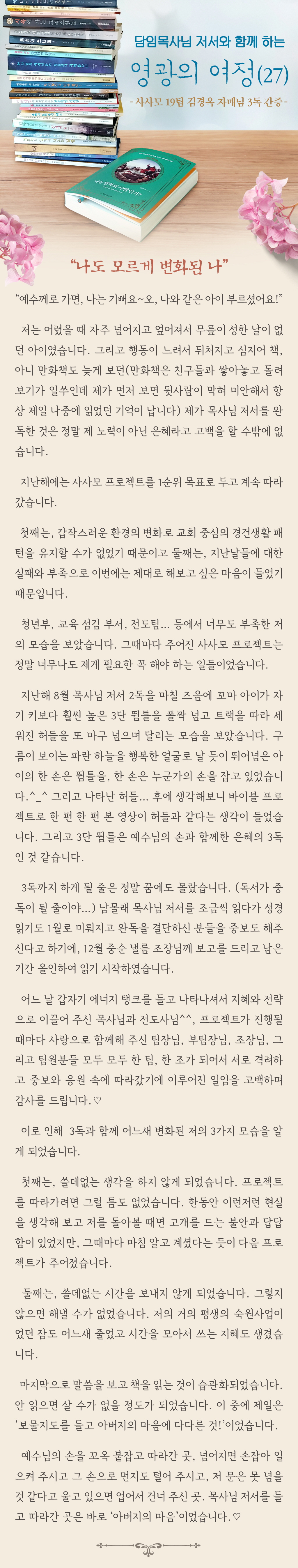 "담임목사님 저서와 함께 하는 영광의 여정 (27)" (사사모 19팀 김경옥 자매님 3독 간증)
