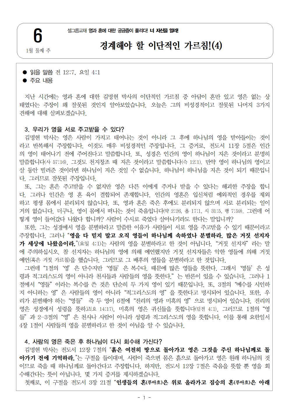 | 다음글 | [영과 혼에 대한 궁금증이 풀리다! 너 자신을 알라! 7] 1월 셋째 주 셀그룹 교재입니다. | Web Team | 2026-01-13 11:34:00 |