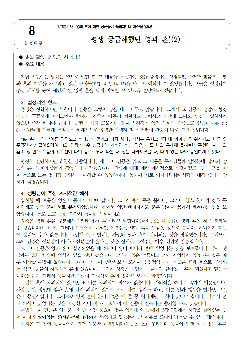 | 다음글 | [영과 혼에 대한 궁금증이 풀리다! 너 자신을 알라! 9] 1월 다섯째 주 셀그룹 교재입니다. | Web Team | 2026-01-27 11:21:00 |