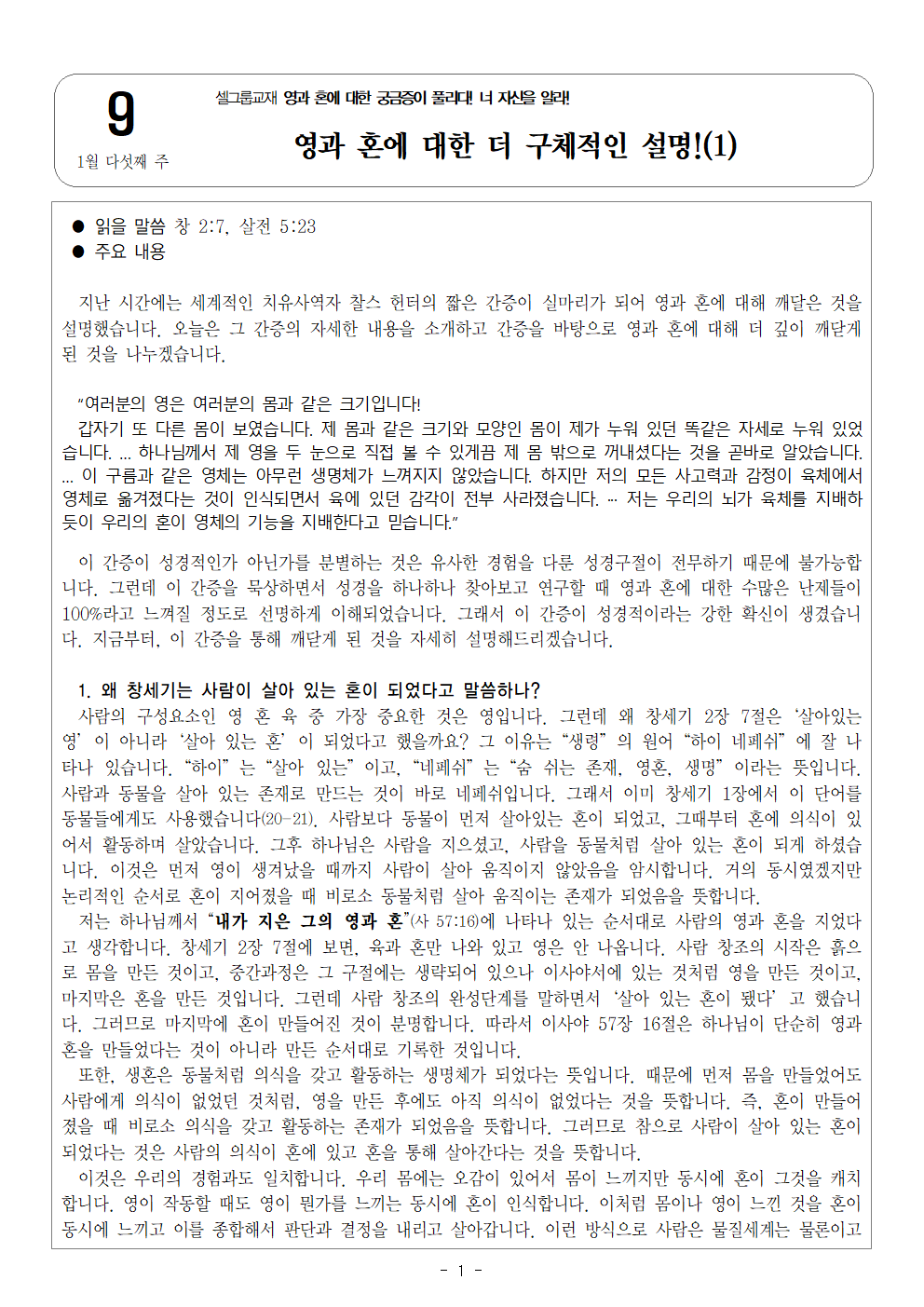 | 이전글 | [영과 혼에 대한 궁금증이 풀리다! 너 자신을 알라! 8] 1월 넷째 주 셀그룹 교재입니다. | Web Team | 2026-01-20 11:10:00 |