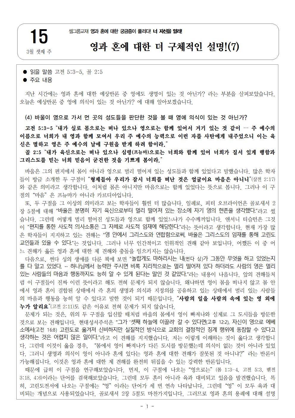 | 다음글 | [영과 혼에 대한 궁금증이 풀리다! 너 자신을 알라! 16] 3월 넷째 주 셀그룹 교재입니다. | Web Team | 2026-03-24 00:00:00 |