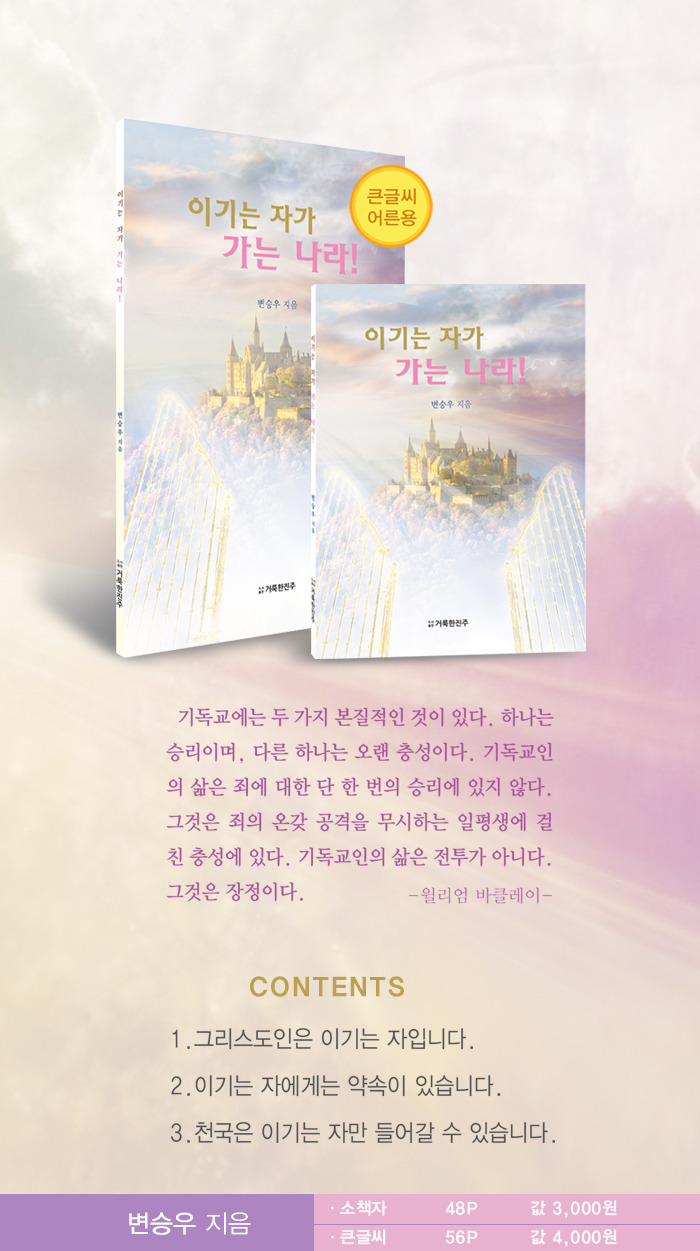 솔직히 이것이 이 시대의 교회와 신자들을 보는 저의 마음입니다. 그래서 「오직 기독교가 길이요 진리요 생명이다!」라는 소책자의 원고를 탈고한 지 불과 몇 시간 만에 「이기는 자가 가는 나라!」라는 본서의 원고를 서둘러 탈고한 것입니다.