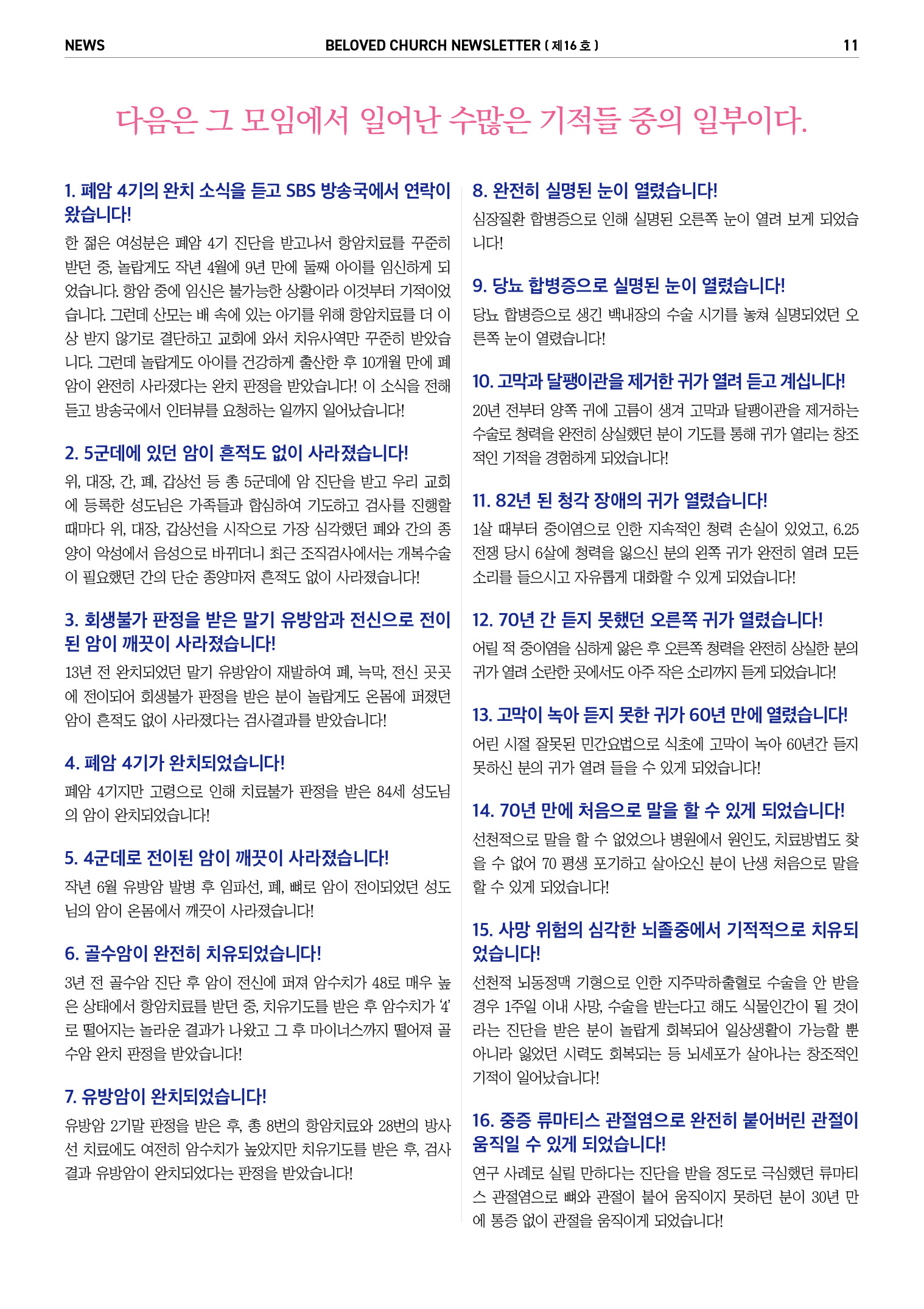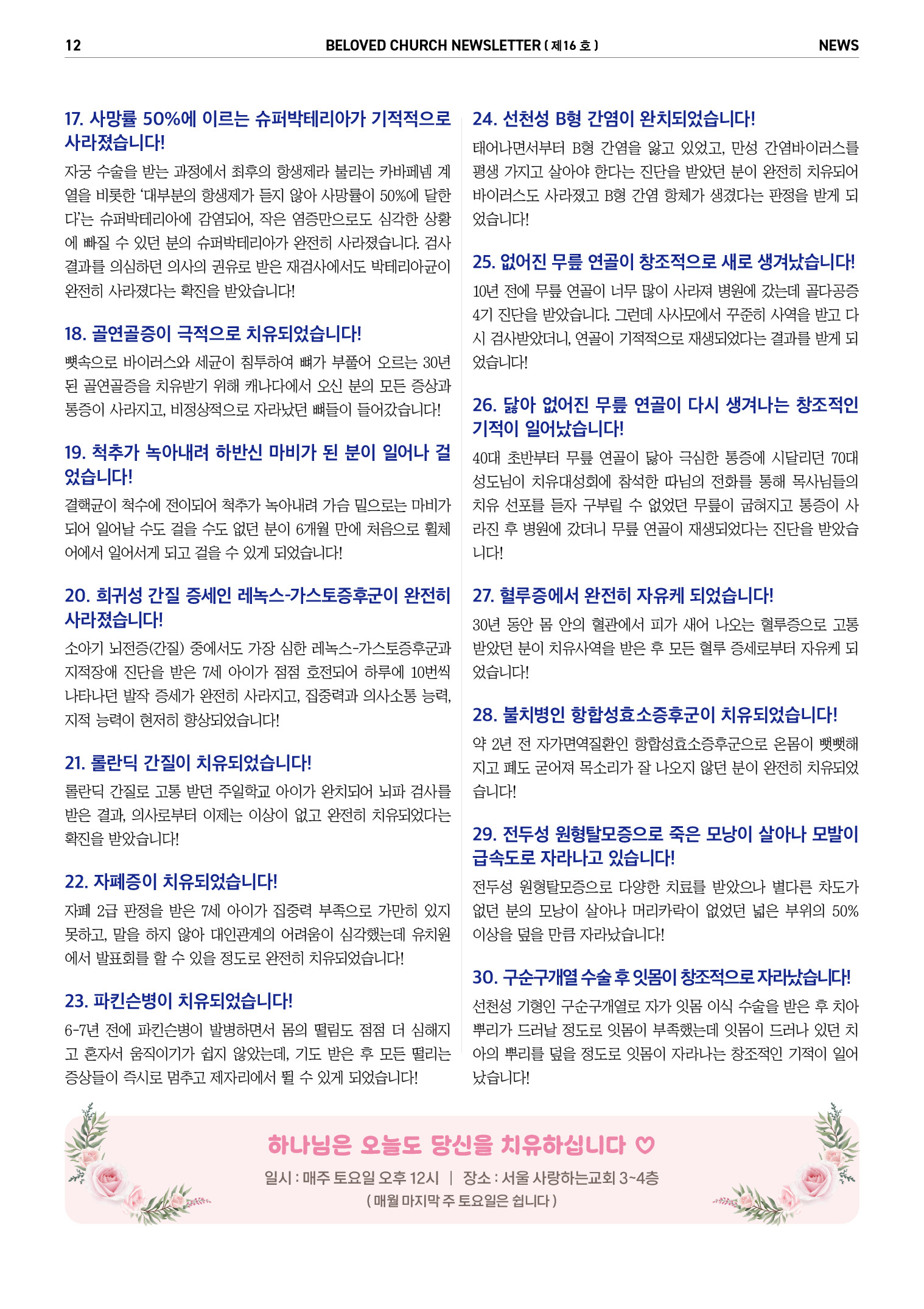 | 이전글 | 25. 11. 1. 사사모 쇼츠 - 20년 동안 사고로 사라졌던 꼬리뼈가 생겨나고 무릎의 물이 차던 증상도 사라졌습니다! | 사랑하는교회 | 2025-11-19 11:19:52 |