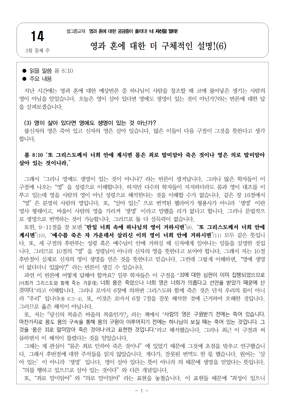 | 다음글 | [영과 혼에 대한 궁금증이 풀리다! 너 자신을 알라! 15] 3월 셋째 주 셀그룹 교재입니다. | Web Team | 2026-03-17 00:00:00 |